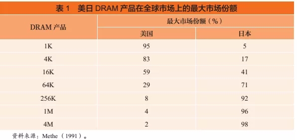 其二,日本企业凭借在当时技术最先进的集成电路产品——动态存储器(DRAM)上的突破,带动整个集成电路产业的爆发式成长。在两大联合攻关项目成果的支撑下,日本企业在当时最有代表性的集成电路产品——动态存储器上实现了对美国同行的赶超。1978年,日本富士通公司比美国IBM、莫斯泰克、德州仪器早半年发布存储容量为64K的动态存储器。1980年,日本电器通信研究所成功研制出存储容量为256K的动态存储器,领先美国企业两年。在当时技术含量最高的集成电路产品上取得技术和市场的双重领先优势后(见
