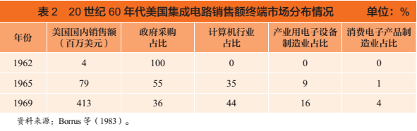 集成电路发明后,美国联邦政府在20世纪60年代初中期实施民兵II型( Minuteman II)洲际弹道导弹等重大军工项目,以及“阿波罗计划”等大型航天工程,以政府采购方式形成了对集成电路持续的前沿“市场”需求(见