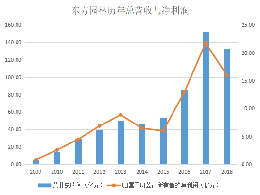 东方园林于2009年底在深交所上市。上市后,业绩整体保持上涨态势。2018年,公司总营收为132.93亿;净利润为15.96亿;与十年前(2009年)相比,涨幅分别为21.76倍和18倍。事实上,2009年—2018年,十年时间,东方园林净利润合计高达86.89亿。下图为红岸研究中心根据财报绘制的东方园林历年总营收与净利润走势: