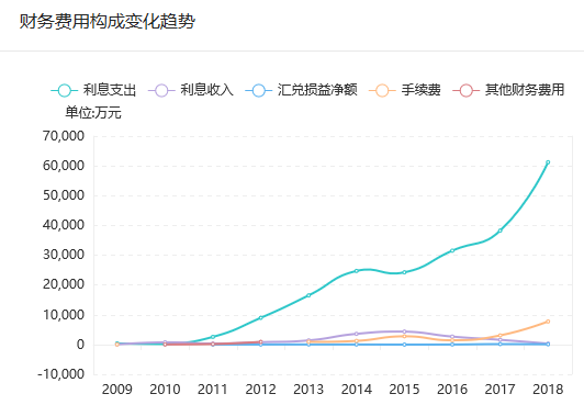 在面临重新修订合同和应收账款难以在短时间收回的背景下,东方园林的财务费用却在不断增加。据财报,2018年,公司财务费用高达6.87亿,同比暴涨72.18%。下图所示为近10年东方园林财务费用构成变化趋势: