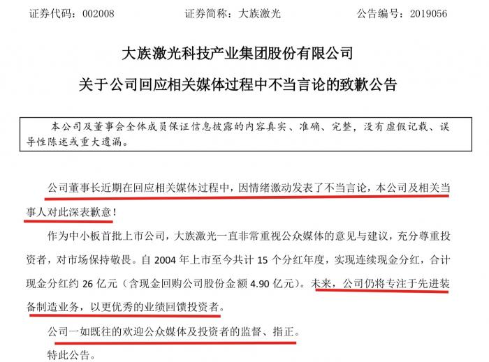 8月1日晚,大族激光发布公告称,“因情绪激动发表了不当言论,本公司及相关当事人对此深表歉意!”其谈到充分尊重投资者,已经分红26亿,未来会以更优秀的业绩回馈投资者。