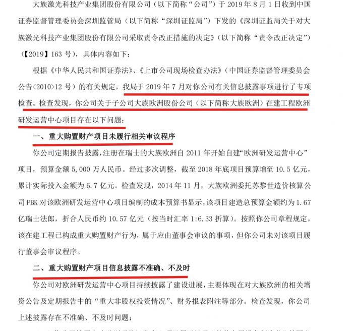 对于近期市场曝出的大族激光欧洲研发中心之迷,深圳证监局通过信息披露专项检查发现公司存在多个问题,第一重大购置财产项目未履行相关审议程序;第二重大购置财产项目信息披露不准确、不及时。证监局对公司采取责令改正措施。