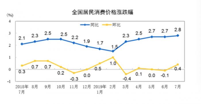 7月全国居民消费价格同比上涨2.8%,涨幅比上月扩大0.1个百分点,创下年内新高。