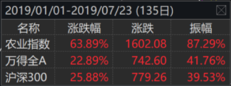 今年以来,A股农业股普遍表现强劲,在非洲猪瘟、贸易摩擦等概念驱动下,农业板块相对大盘有了明显上升。在同期沪深300指数上涨25.88%的情况下,WIND农业指数暴涨了63.89%,最高涨幅甚至接近90%。
