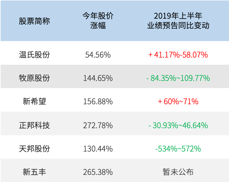 在已公布2019年上半年业绩预告的农业板块上市企业中,实际业绩只能说是喜忧参半,表现较好的依然是温氏股份、新希望等本身已在行业中处于龙头地位的公司,而上半年股价涨幅明显的牧原股份、正邦科技、天邦股份等个股业绩均有大幅同比下调,如果说2018年年度业绩还不能反映2018年底爆发非洲猪瘟带来的利好因素,那2019年上半年喜忧参半甚至下滑的业绩,可能只会让市场对之前的良好预期打上问号。