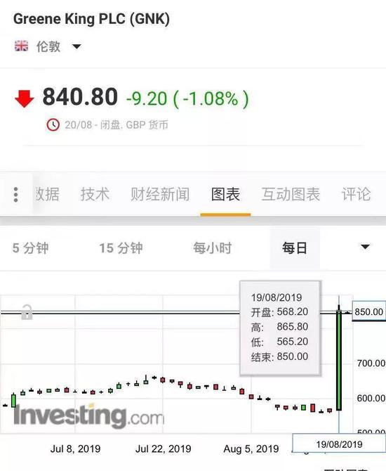该消息公布后,包括Greene King在内的多只英国酒吧股都出现不同程度的上涨。其中,Greene King股价一度从每股570便士快速蹿升至每股849便士;Marston’s Plc、JD Wetherspoon Plc等股价也都有不同程度的上涨。