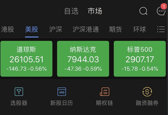 受消息影响,美股三大股指悉数低开,道琼斯指数跌0.56%,下跌超过100点,纳斯达克跌0.59%,标普跌0.54%。