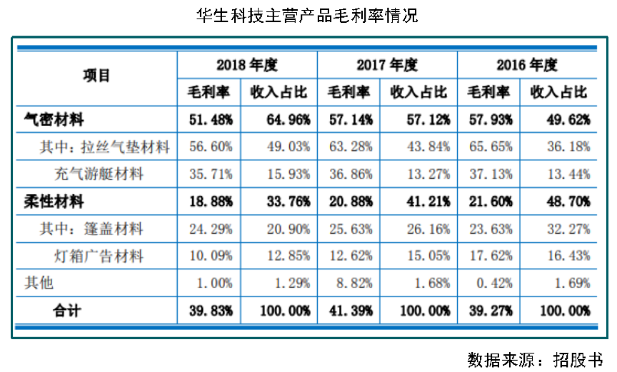 华生科技表示,2016-2018年,公司拉丝气垫材料收入分别为7382.71万元、11371.21万元和15442.42万元,2017年、2018年分别同比增幅为54.02%、35.80%,收入呈快速增长趋势;拉丝气垫材料收入占同期主营业务收入比重分别为36.18%、43.84%和49.03%,是华生科技收入增长主要驱动力。从构成上看,华生科技的盈利主要来源于气密材料,其对主营业务毛利的贡献率均达到70%以上。