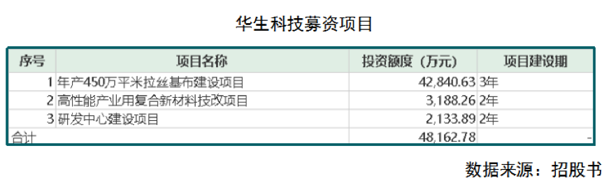 华生科技本次募集资金计划用于“年产450万平方米拉丝基布建设项目”、“高性能产业用复合新材料技改项目”和“研发中心建设项目”三个项目,资金投向公司目前业务,或为业务的延伸。