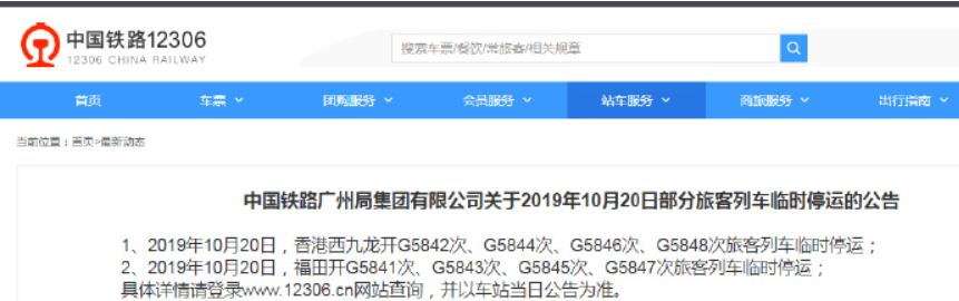 12306网站10月20日发布中国铁路广州局集团有限公司关于部分旅客列车临时停运的公告称,今天香港西九龙开G5842次、G5844次、G5846次、G5848次旅客列车,以及福田开G5841次、G5843次、G5845次、G5847次旅客列车临时停运。
