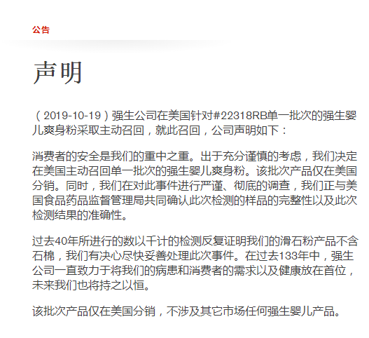 20日,强生(中国)官网就“在美国针对#22318RB单一批次的强生婴儿爽身粉采取主动召回”一事发声明称,该批次产品仅在美国分销。据媒体报道,此前,美国食品和药物管理局在一瓶强生婴儿爽身粉内发现少量致癌物石棉,涉及产品大约为3.3万瓶。