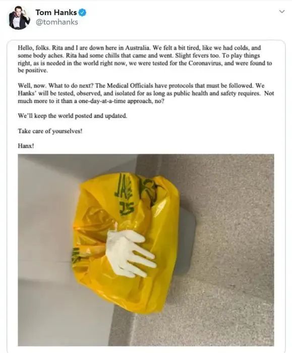 “我们会及时发布和更新我们的最新状况,照顾好你们自己。”汤姆·汉克斯提醒。