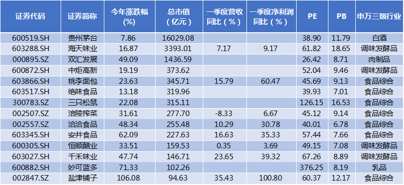4月以来,食品饮料板块共有14只个股刷新历史高点,虽说是“食品饮料”行业,但实际上,在申万二级行业分类下,“饮料制造”行业仅股王贵州茅台一家,其余13家则均为“食品加工”行业。具体来看,13家食品公司中,以桃李面包、绝味食品、三只松鼠为代表的食品综合类占据7席;调味品占据4席,包括海天味业、中炬高新、恒顺醋业、千禾味业;其余2家为肉制品的双汇发展和乳品的妙可蓝多。