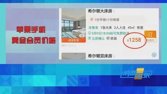 而价值更高的苹果手机,携程的黄金会员,按条件应该享受更优惠的价格,但依然和中档手机、普通会员一个价,房间价格也是1258元。