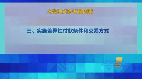 北京奥古律师事务所主任律师 暴杰:“在2021年的2月7日,国务院反垄断委员会印发了关于平台经济领域的反垄断指南,重点指出了关于差别待遇,以及大数据杀熟具体的认定,我们认为可以考量以下几个因素,第一个因素是如果我们发现行为是基于大数据和算法,根据交易相对人的支付能力、消费偏好用户习惯等,实施差异性交易价格或者其他交易条件的,这种我们就可以认定是其中之一。第二种实施差异性标准、规则和算法的。第三种是实施差异性付款条件和交易方式的。”
