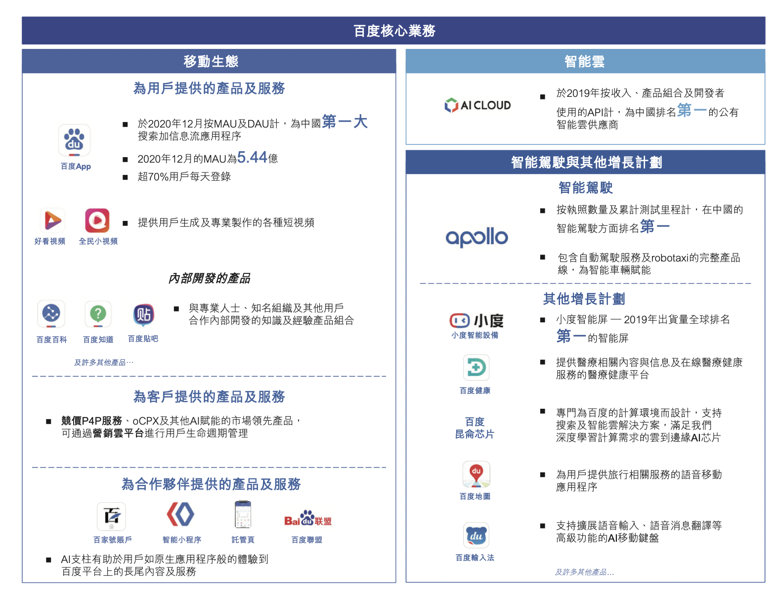 根据CIC 报告,百度是为数不多的提供全栈AI的公司之一,基础设施包括AI芯片、深度学习框架、核心AI功能(例如自然语言处理、知识图谱、语音识别、计算机视觉和增强现实)及开放式AI平台以协助广泛应用及使用。