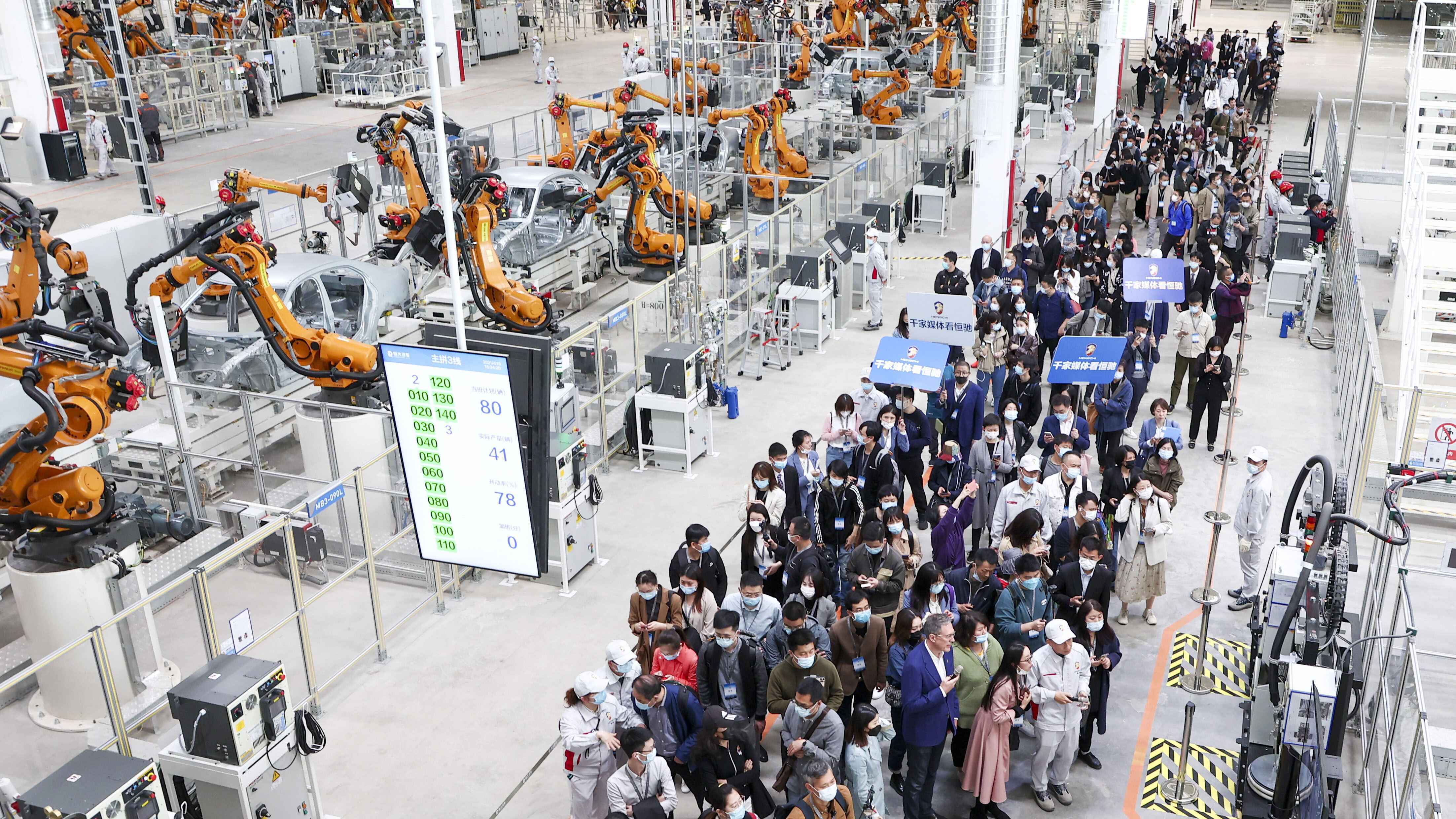 生产全流程的智能化,带来效率的极大提升,据了解,恒大汽车基地已经实现在多个关键流程100%自动化率,可以做到24小时不间断生产。