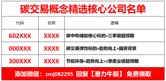 根据以上逻辑,我们结合基本面和技术面综合分析,精选出了出一份《碳交易概念精选核心公司名单》。投资者朋友们可以加微信:zmj082295 回复【潜力牛股】 免费领取(或者长按识别下方二维码即可领取)