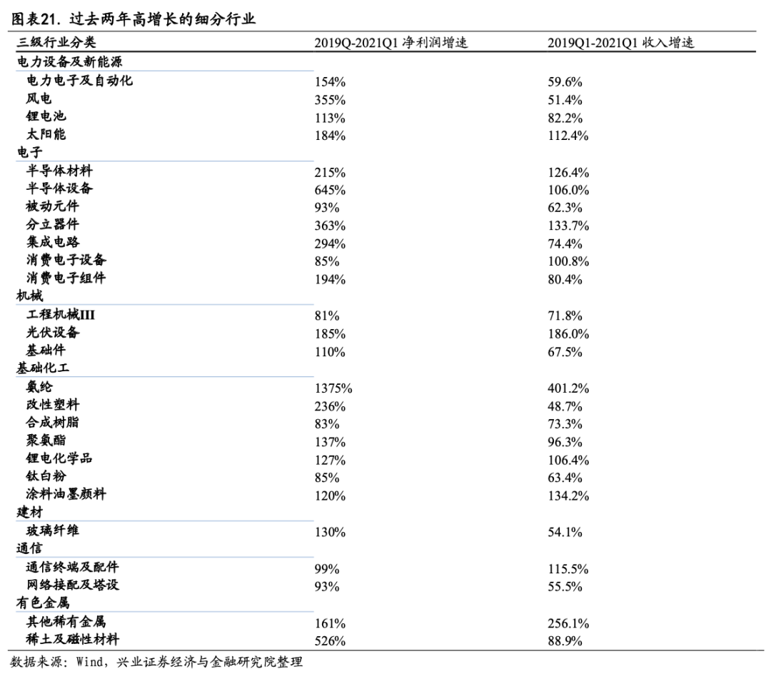 2019年底我们率先发布深度报告《先进制造业的核心资产崛起》,并在2020年中期提出科创驱动的朱格拉周期已经开始,我们的判断已经被验证。过去两年,中国供应链体系日益强大,一批高增长的先进制造业细分行业机会涌现。2021Q1相比2019Q1,我们筛选出了收入年均复合增长超过20%、净利润复合增长率超过30%的公司,发现主要集中在电力设备及新能源、电子、机械、通信等行业。