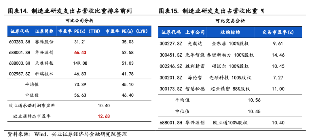 案例分析:华兴源创完成科创板第一例重大资产重组。华兴源创是科创板第一家上市公司,3月28日成为科创板第一家提出重大资产重组申请的公司。从披露信息看此次申请,公司拟以10.4亿元价格收购欧立通100%股权(业务相协同,都是消费电子终端模组),其中3.12亿元通过增发募资支付,7.28亿元以股权对价支付。从此次重大资产重组预案来看,二级市场估值较大幅度高于一级市场。参考15年创业板并购潮,可能会出现公司从二级市场低成本(高估值)募资、在一级市场低价收购优质资产,实现业绩外延扩张,推动二级市场股价上涨的现象。