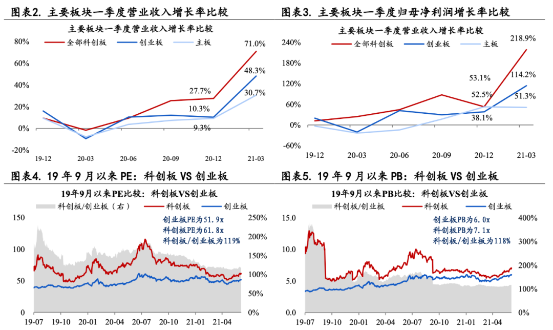 1)科创板相对业绩优异。成长板块的超额收益与其超额业绩相对应,2021年一季报出炉,科创板营收增速71.0%,较19Q1复合增速为29.1%;归母净利润增速218.9%,较19Q1复合增速为99.2%,相对业绩增速大幅优于主板和创业板。
