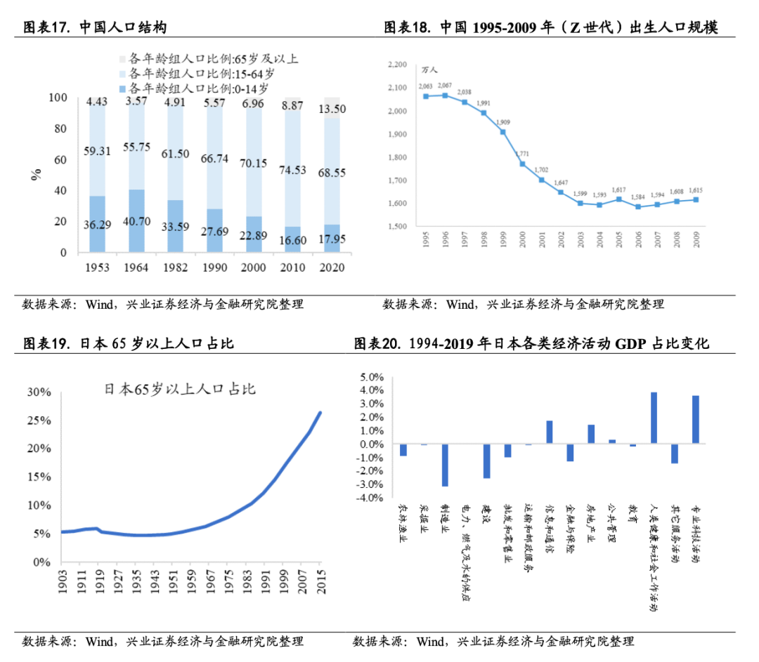 老龄化社会对医疗服务的需求显著上升。日本1994年-2019年各类经济活动占GDP比重中,人类健康和社会工作活动占比提升了3.9个百分点。