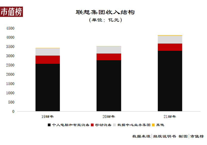 当前,联想集团的主要收入来自智能设备业务,包括个人电脑和智能设备、移动设备,这一业务实现的收入比重近90%。