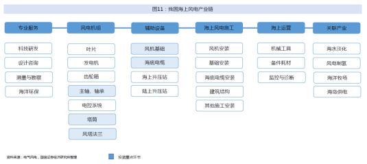 产业链方面,海上风电投资大致分为主体工程投资(90%)和其他费用(10%),主体工程投资主要包括:风电机组(含塔筒)、风电机组基础、场内集电线路(阵列电缆)、送出海缆、海上升压站、陆上集控中心组成。