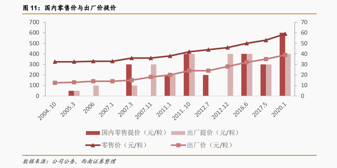 经常与东阿阿胶相提并论的片仔癀,也是提价常客。根据西南证券统计的数据,从2004年至2020年,片仔癀锭剂产品一共提价19次。片仔癀锭剂的出厂价从2004年的125元/粒升至2020年1月初的390元/粒,提价幅度为212%,零售价从325元/粒上涨至590元/粒,提价幅度为81.54%。