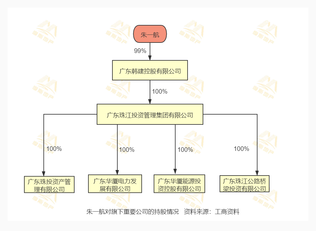 朱一航旗下还有广东珠江投资管理集团有限公司(以下简“称珠江投资集团”),该公司注册资本高达41.72亿元。通过这家企业,他实现了对广东华厦电力发展有限公司、广东珠江公路桥梁投资有限公司、广东华厦能源投资控股有限公司(以下简称“华厦能源投资”)、广东珠投资产管理有限公司等的控制。其中华厦能源投资揽括煤炭、电力、铁路、港口等7家公司。