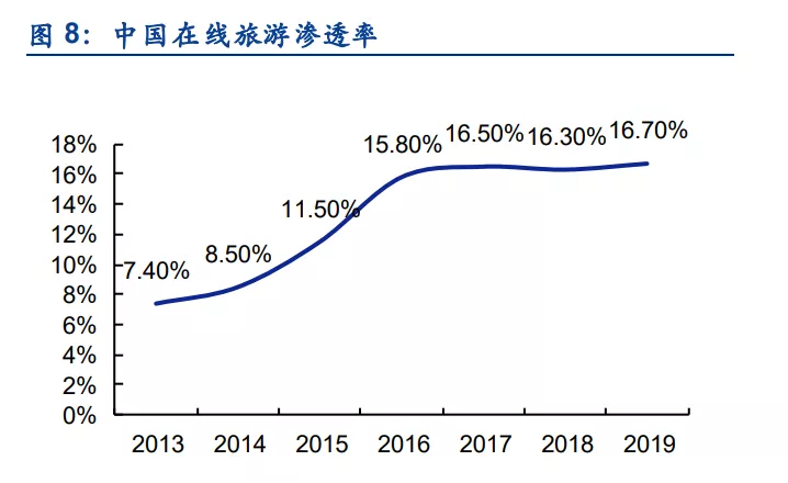 落到OTA,2018年以前,国内的OTA交易规模增速较快。随着互联网普及率快速提升红利的消退,市场变得成熟,增长率也开始下滑,2018年和2019年,跌至10%左右。