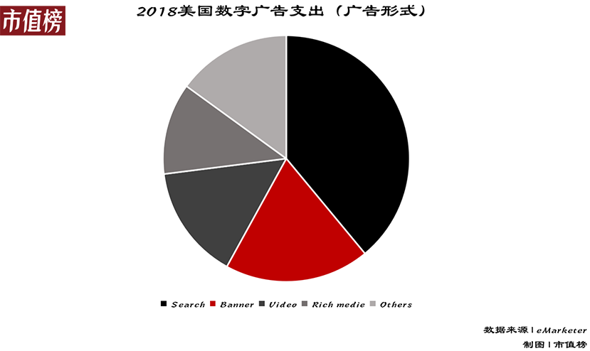 2018年美国数字广告支出中,搜索、展示、视频合计占据了73%的市场份额,其中搜索占比39%;