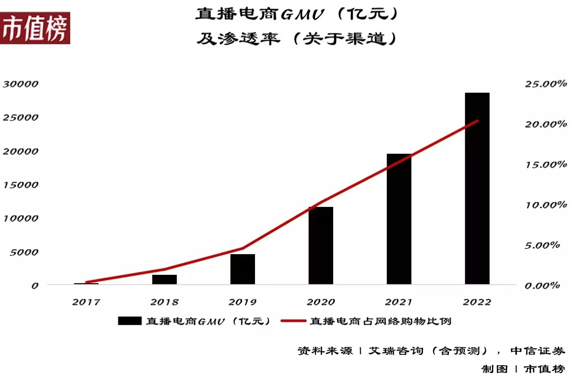 2017年至今年上半年,直播电商市场规模从366亿增长到接近2万亿,且市场渗透率还不到15%;