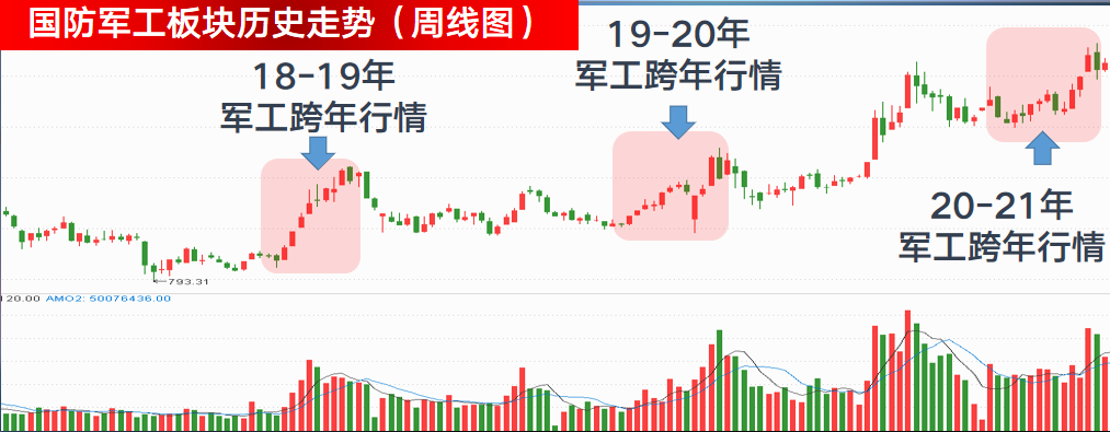 18~19年,军工跨年行情,板块涨幅34%;19~20年,军工跨年行情,板块涨幅25%;20~21年,军工跨年行情,板块涨幅36%。