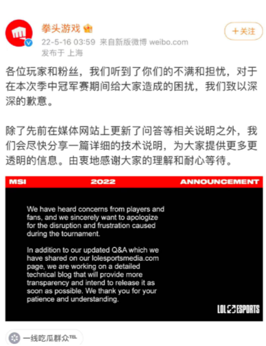 迫于舆论压力,5月16日凌晨,英雄联盟主办方拳头游戏不得不连夜发表道歉声明,对于本次比赛因为技术原因导致的诸多困扰,深表歉意。