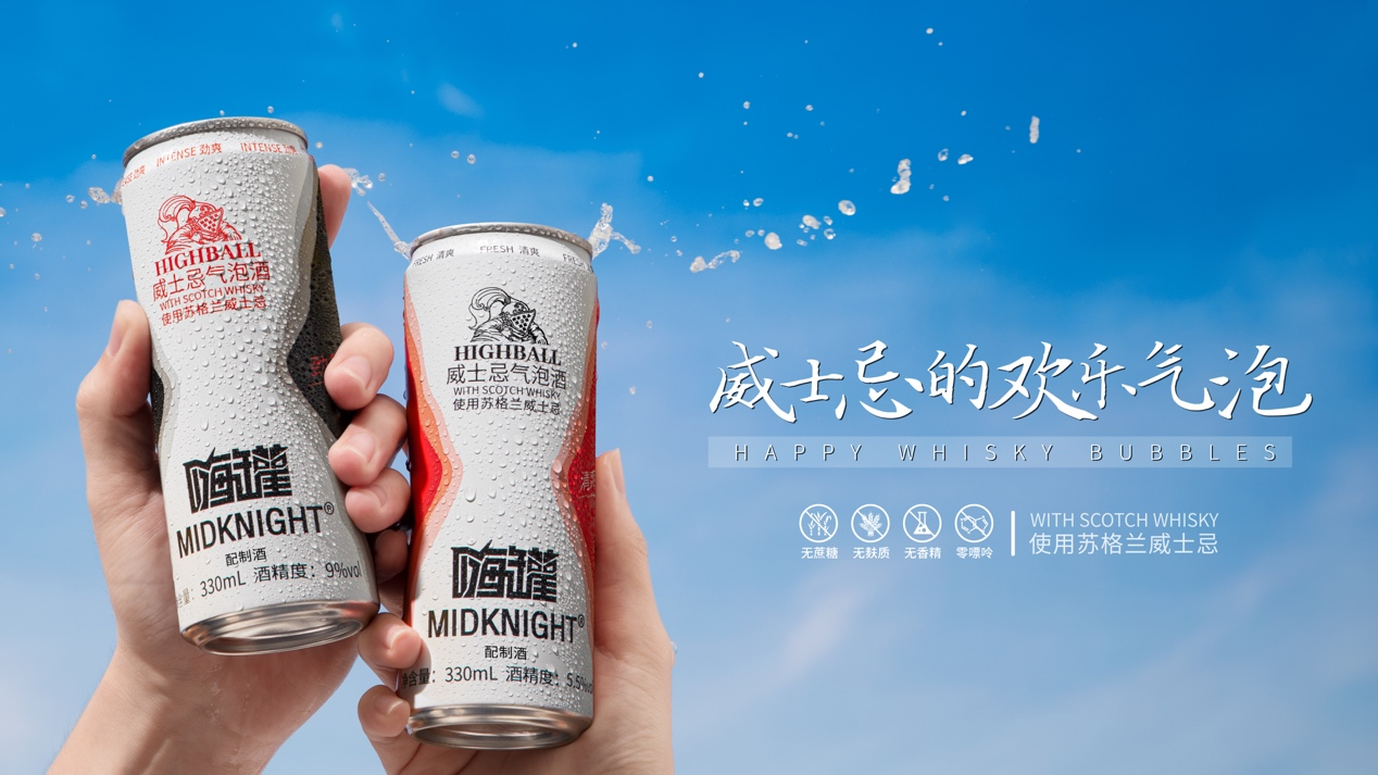 近些年来,威士忌在中国的增长速度越来越快。调查中发现,越来越多的人们喜欢威士忌中丰富的水果和花香的味道,随之带来了风靡全球的highball这种喝法,因其使用蒸馏的威士忌调制而成,在气泡水的作用下,更好的放大了威士忌中原有的香气和风味,使其酒精度更低、更适口,更清爽,而MIDKNIGHT嗨罐无嘌呤的特质,也使得更多的人喜欢和接受。