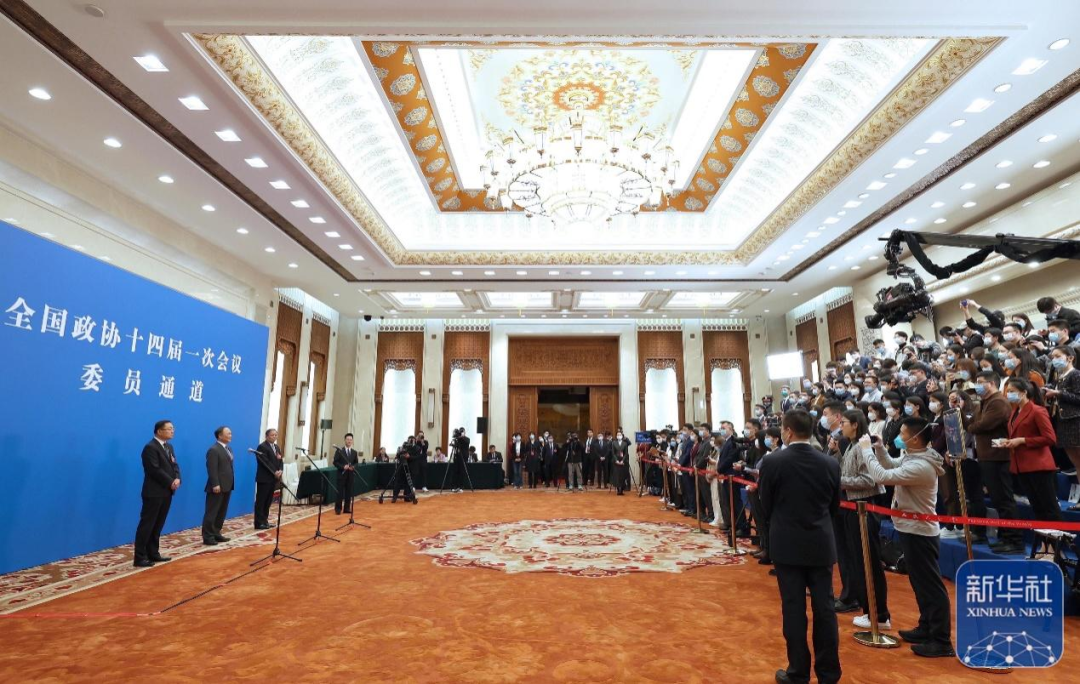 全国政协十四届一次会议委员通道开启,政协委员与媒体记者进行面对面交流