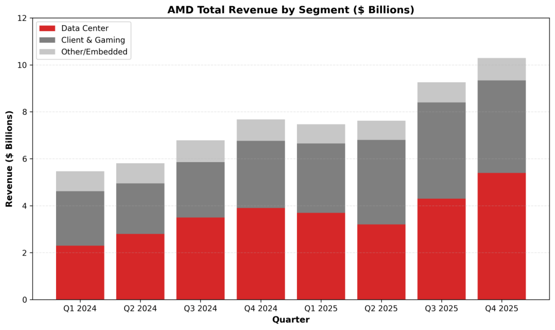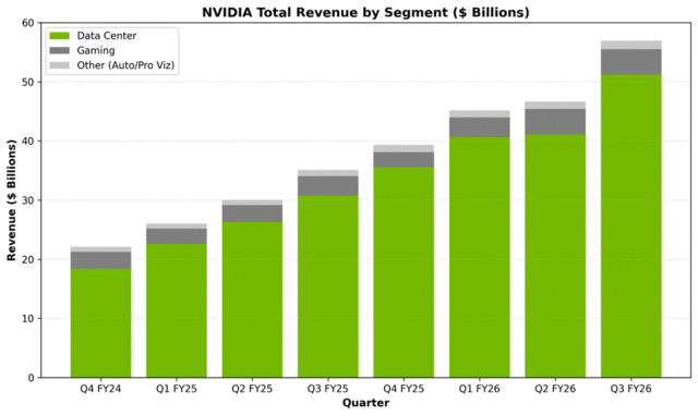 GPU短缺的一个重要方面是它与持续的内存供应限制密切相关,虽然这是一个重要因素,但还有另一个方面值得探讨。自2023年以来,随着基础设施建设的加速,GPU制造商的收入变化呈现出一个共同的趋势。当我研究各个细分市场的季度收入变化时,结论很简单:企业/数据中心增长带来的资金 正以前所未有的速度增长,并且比以往任何时候都更具吸引力。