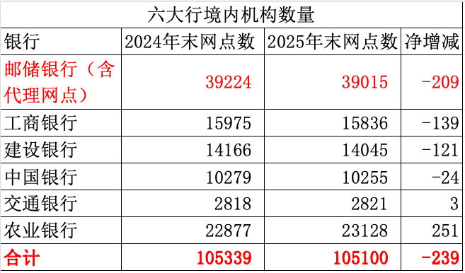 据年报显示,截至2025年末,六大行境内线下分支机构总量约105100个,较2024年末净减少约239家,创下近三年来最小缩减规模。