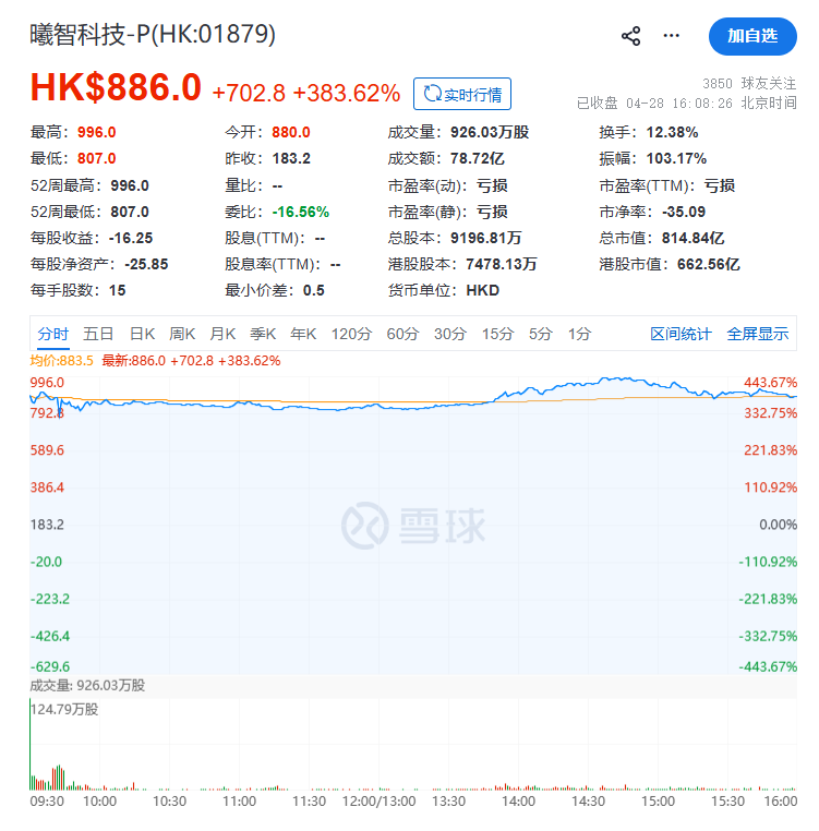 一开盘,股价就从183.2港元/股的发行价飙到880港元/股,暴涨超过380%,市值冲破800亿港元。
