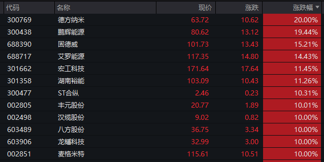 主要行业板块和赛道方面,若按照申万一级行业划分,电力设备板块领涨,板块涨幅接近3%,板块在临近上午收盘时出现一波拉升,板块内个股掀起涨停潮。具体来看,德方纳米20%涨停,丰元股份、汉缆股份、八方股份、龙蟠科技等多股10%涨停。