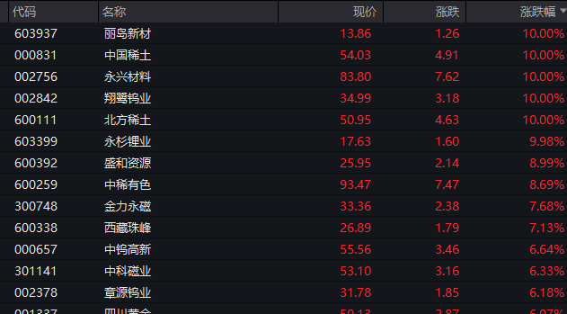 有色金属板块在临近上午收盘时也扩大涨幅,板块涨幅接近3%,中国稀土、北方稀土等多只稀土概念股涨停。