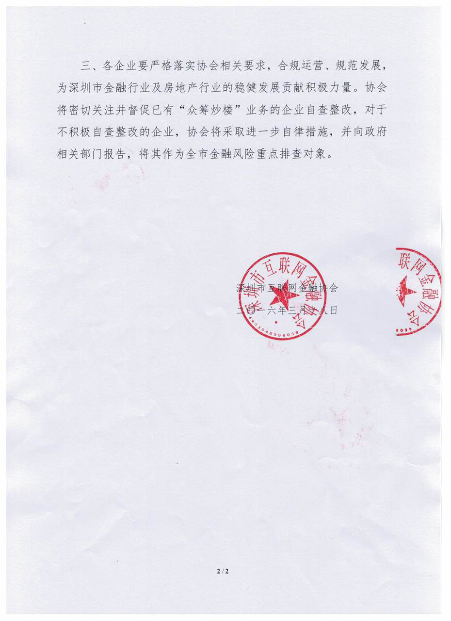 紧接着4月12日,深圳市互联网金融协会向会员单位下发了《深圳市互联网金融协会关于停止开展房地产众筹业务的通知》。