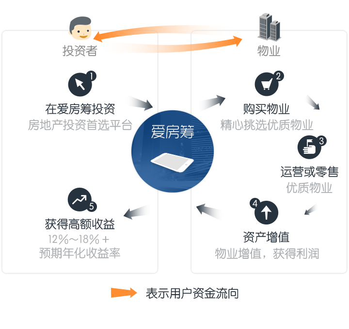 从这个商业模式图上看,就是投资人集资购买物业,然后将其出租或者出售,获得资产的增值回报。