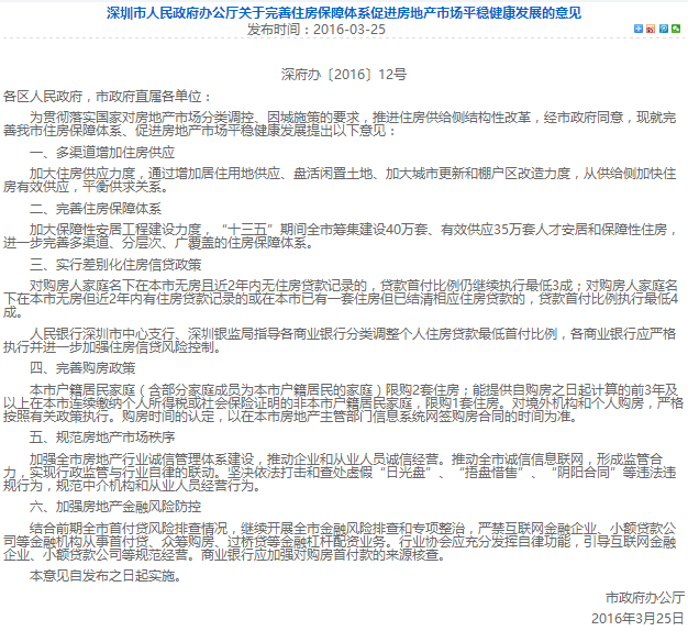 其二,就是因为在今年的3月25日,深圳市住房和建设局出台了一个叫 《深圳市人民政府办公厅关于完善住房保障体系促进房地产市场平稳健康发展的意见》的意见: