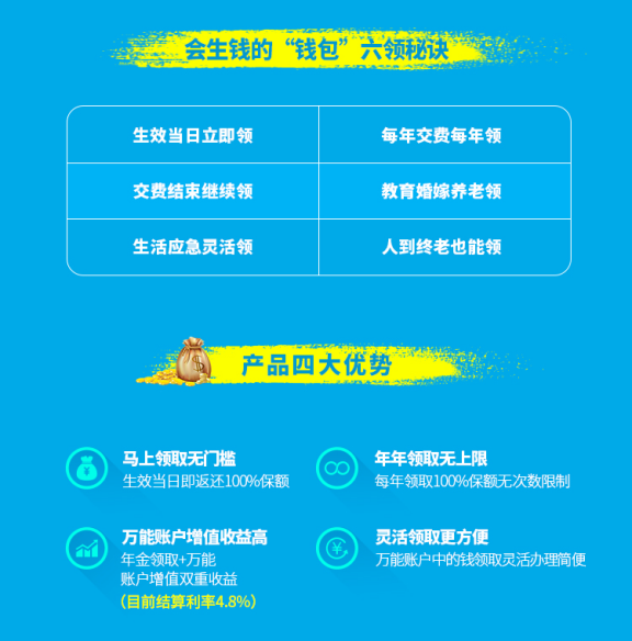 ③ 赠送万能账户,可享受年金领取+万能账户增值双重收益(目前结算利率4.8%)。如果手头有其它闲置资金,但没有更稳妥的投资方式,还可以随时存入万能账户享受日复利计息;