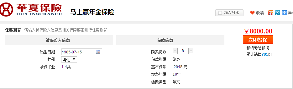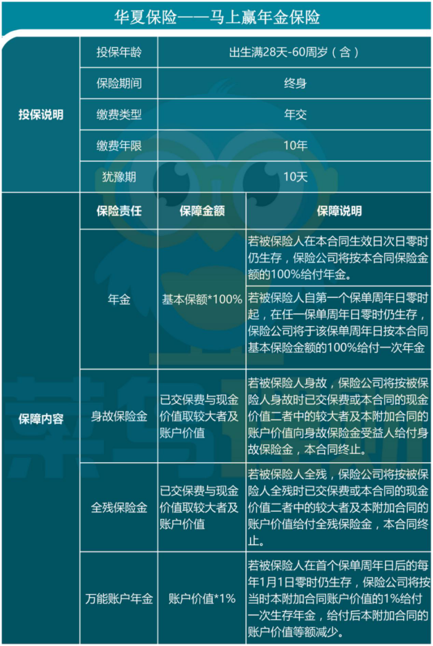 说了这么多,菜导结合最近一款网上卖得比较火爆的年金保险——“华夏保险——马上赢年金保险”,给大家具体评测一下。