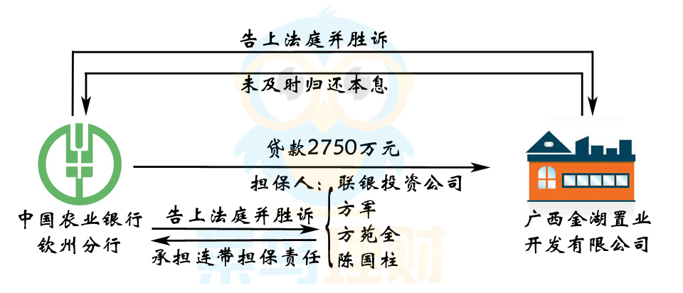 这个诉讼的大概意思是“中国农业银行钦州分行”贷了3笔共2750万元贷款给“广西金湖置业开发有限公司”,这笔贷款的担保人是联银投资公司、方军、方苑全、陈国柱。