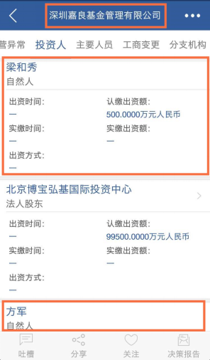 这位借款人就是深圳嘉良基金管理有限公司,菜导查它的工商信息,发现在股东信息中,方军、梁和秀赫然在列!