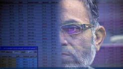 图为一名中国男子边卖香蕉边观看股市行情,他身旁是一位道路清洁工和一位行人。尽管中国经济增速放缓至24年来的最低水平,但是股市过去已经飙涨逾一倍,这在很大程度上得益于这样的普通炒股者。
